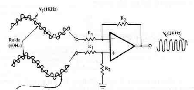 Para calcular la ganancia en modo común de esta etapa vamos a aplicar una tensión igual en las dos entradas diferenciales. Por tanto \(V_A = V_B = V_{CM}\). Así conseguimos la siguiente expresión para la tensión de salida. \[V_{out} = – \frac{R_9}{R_1} V_{CM} + \left(1 + \frac{R_9}{R_1} \right) \frac{\beta R_8 + R_7 }{ \beta R_8 + R_7 + R_6} V_{CM} \] También identificaremos \(R_{ref} = \beta R_8 + R_7\) para facilitar las operaciones. \[V_{out} = – \frac{R_9}{R_1} V_{CM} + \left(1 + \frac{R_9}{R_1} \right) \frac{R_{ref}}{R_{ref}+ R_6} V_{CM} \] Idealmente, querríamos que esta tensión fuese igual a 0, de manera que el amplificador de instrumentación pudiese rechazar completamente para poder, por ejemplo, eliminar el ruido acoplado en ambas entradas tal y como puede verse en la figura.