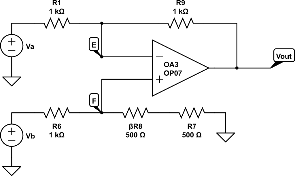\[V_{out} = – \frac{R_9}{R_1} V_A + \left(1 + \frac{R_9}{R_1} \right) \frac{\beta R_8 + R_7 }{ \beta R_8 + R_7 + R_6} V_B \]