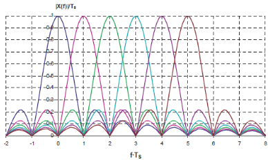 Cada sinc representa una portadora, de manera que se envía un símbolo en un período de tiempo \(T_s\).