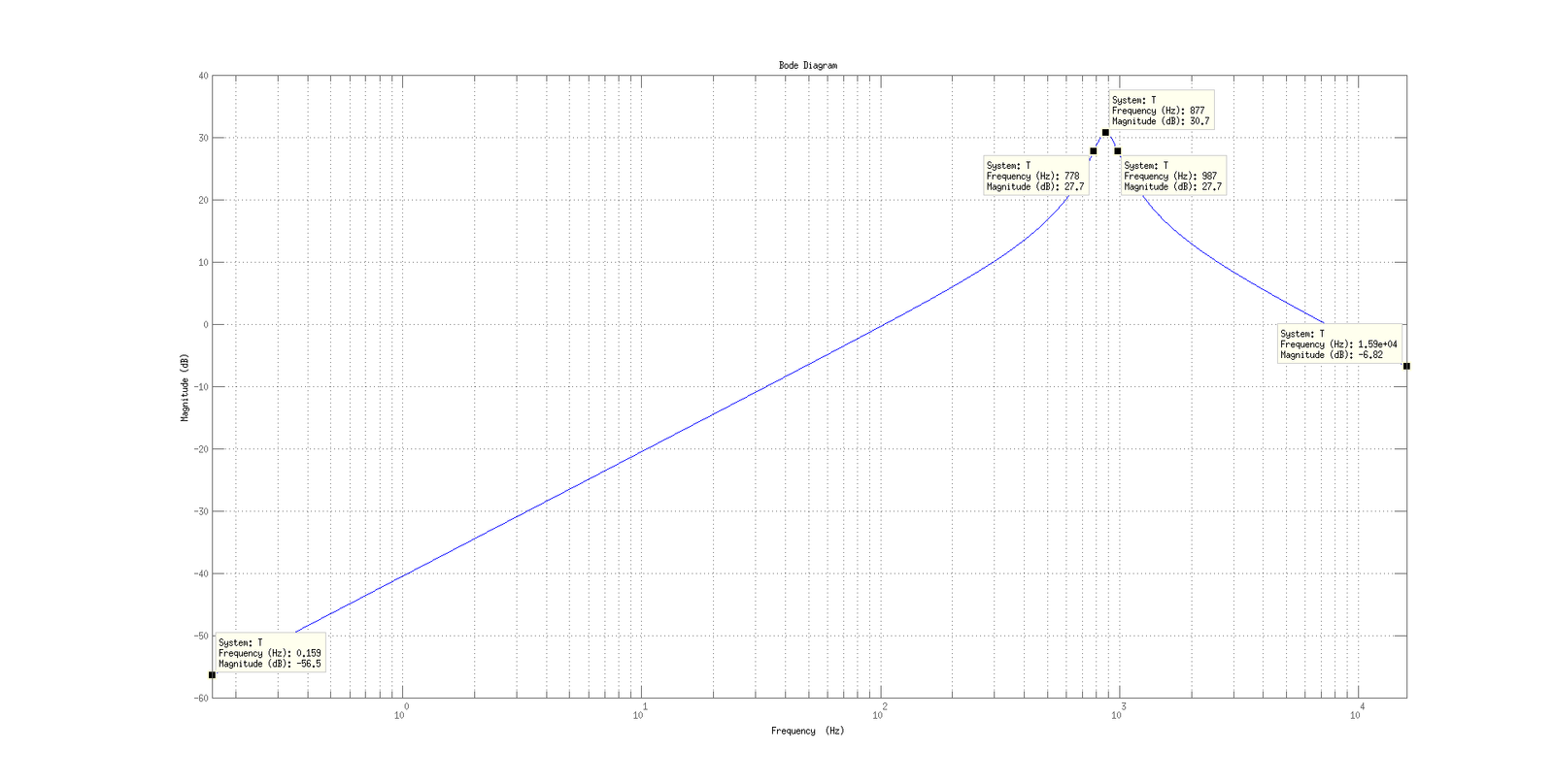 Diagrama de Bode del filtro paso banda con realimentación multiple(Al hacer la gráfica, tened en cuenta que por defecto el eje de coordenadas está en radianes/s)