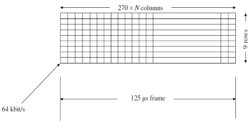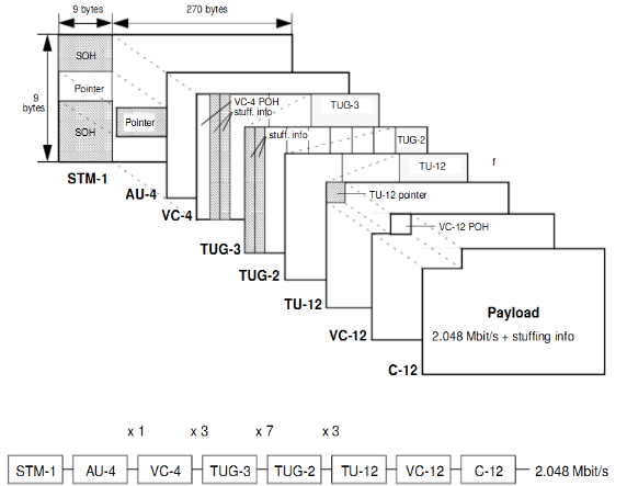 Las tramas de 125 μs están construidas por el contenedor básico llamado STM (Synchronous Transport Module), en el que cada uno equivale a 64 kbps.